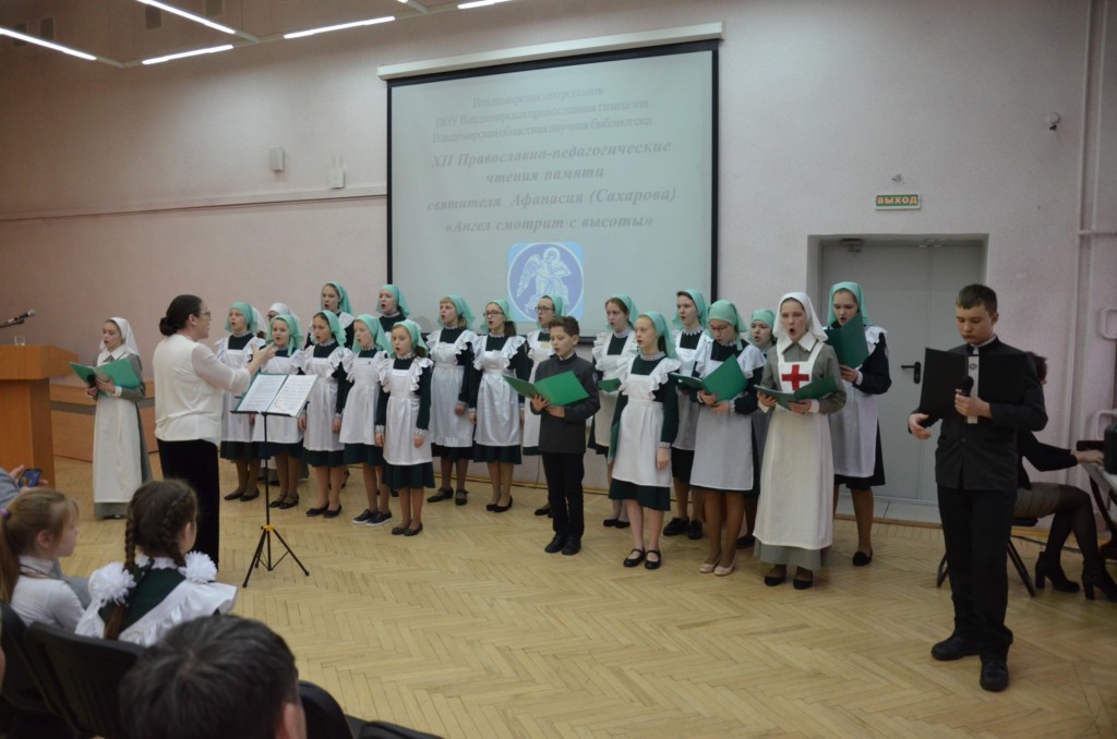 XII Православно-педагогические чтения памяти свт. Афанасия (Сахарова) «Ангел смотрит с высоты» прошли 21 марта во Владимирской областной универсальной научной библиотеке имени М. Горького. Организаторами проекта являются Владимирская митрополия и Негосударственное общеобразовательное учреждение Православная гимназия во имя святителя Афанасия епископа Ковровского. Чтения открыл директор Владимирской православной гимназии, лауреат премии «За нравственный подвиг учителя» протоиерей Алексей Головченко с докладом «Проект Владимирской православной гимназии «Ангел смотрит с высоты». Большой интерес у слушателей вызвала работа «Национальная система образования: традиционные ценности и современные реалии» доцента Московского государственного областного университета, кандидата исторических наук, лауреата Макариевской премии Розиной Ольги Владимировны. В рамках мероприятия были представлены два открытых урока: первый урок в 10 классе «Итоги дворцовых переворотов в России XVIII века», второй для учащихся 4 класса по духовно-нравственному воспитанию «Небопашцы» (по сказке И. Рутенина «Журавушки»).