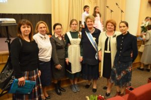 18 мая 2017 года в конференц-зале гостиницы «Даниловская» состоялось торжественное мероприятие «ЖЕНСКИЙ ПОДВИГ В ИСТОРИИ РОССИИ. 1917-2017 ГОДЫ». Со вступительным словом выступила Председатель МОО «Союз православных женщин» Жукова Н.Б. Затем всех приветствовал епископ Воскресенский Савва, викарий Святейшего Патриарха Кирилла, заместитель Главы Всемирного Русского Народного Собора, доктор церковной истории. Ананьина Г.В. (председатель Женского православно-патриотического общества, сопредседатель МОО «СПЖ») в своем выступлении раскрыла тему: «Россией управляет Матерь Божия Державная». В первой части мероприятия прозвучали очень интересные доклады о роли женщины в монастырской жизни, в Великой Отечественной войне, в воинском служении, в милосердии. Рассказывали о новомученицах и исповедницах Российских, о княгине Александре Федоровне, как образце христианской любви. После презентации проекта Вологодского регионального отделения «Ласточки Победы 1941-1945 годов» «Минутой молчания» все присутствующие почтили память погибших в ВОВ. Актрису театра и кино Скороходову Галину Владимировну поздравили с 80-летним юбилеем и вручили ей грамоту и статуэтку из гутного стекла с изображением Елизаветы Федоровны Романовой; ее дочь замечательно рассказала о жизни своих родителей. От Владимирского регионального отделения с докладом «Путь матери: история четырех женщин» выступила ученица 10 класса Православной гимназии им. во имя святителя Афанасия, епископа Ковровского г.Владимира Бояршинова Анастасия.